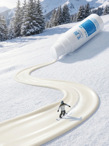 清透玻璃球内悬浮科技感瓶身,微缩艺术构图,3D渲染极简主义设计,未来感雪景背景,冰蓝基座呼应纯净主题。