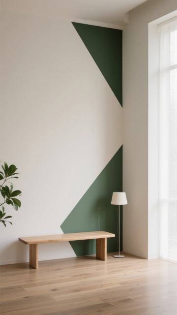 极简主义风格的室内背景,柔和的米白色墙面搭配浅木色人字拼地板,自然光透过米白色半透明窗帘洒入,营造出明亮通透、宁静舒适的氛围。房间中央摆放着一组不同设计的浅灰色布艺沙发,搭配深绿色和浅蓝色的几何图案靠垫,沙发前是一张椭圆形的黑色大理石茶几,上面放置着一个造型简约的玻璃花瓶,插着几支干枯的芦苇。墙上悬挂着一幅抽象风格的装饰画,画面以深蓝色和金色为主色调,呈现出流动的线条感。房间另一侧的墙角摆放着一盆高大的琴叶榕,种植在一个哑光白色的陶瓷花盆中。天花板上安装着一盏造型独特的黑色金属吊灯,灯光温暖柔和。整个空间的配色以低饱和度的灰色、蓝色和绿色为主,搭配原木色的自然质感,展现出简约而不失高级感的现代设计美学。
