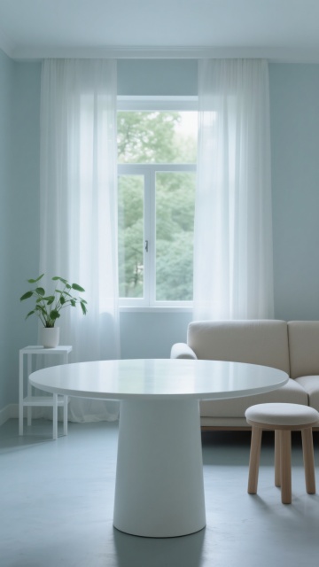 极简主义风格室内场景,柔和的深绿色与原木色整体色调,明亮的自然光透过轻薄的白色窗帘洒入房间,照亮光滑的圆形白色桌面,桌面上无任何物品,浅棕色木地板反射着窗光,窗边白色矮柜上摆放着一盆绿色植物,左侧靠墙处有米色扶手椅和圆形小边几,干净的白色墙壁,整体画面呈现宁静、优雅、略带复古温馨的氛围,高清晰度,柔和光影,细腻质感,简约而不失格调的家居设计。