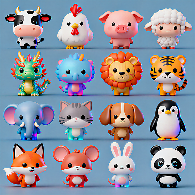 软3D风卡通动物,色彩鲜艳,塑料质感,可爱造型,适合儿童玩具设计。
