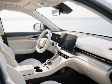 低角度仰拍,一辆银灰色哑光漆面的电动轿跑概念车以45度角斜停在云雾缭绕的悬崖公路边缘,悬浮式车顶与流畅的车身线条在晨雾中勾勒出未来感轮廓,22英寸涡轮扇叶轮毂边缘泛着冷光,车头贯穿式LED灯带正以呼吸频率缓缓闪烁。背景是被初升朝阳染成粉金色的雪山群峰,山腰间缠绕着乳白色的云海,几棵墨绿色松树枝桠从画面右下角斜伸而出形成自然框架。路面湿润泛着光泽,倒映着车身的金属质感,空气中漂浮着细密的冰晶微粒,在阳光照射下形成微型彩虹。汽车左侧后视镜上停着一只蓝色小鸟,与冷峻的科技感形成微妙对比。色调采用蒂芙尼蓝与深空灰的高级撞色,高光处泛着珍珠母贝光泽,阴影部分融入紫罗兰色过渡,整体构图遵循黄金螺旋,车辆位于螺旋中心偏右位置,背景雪山呈放射状向天际线延伸,营造出科技与自然共生的史诗感。