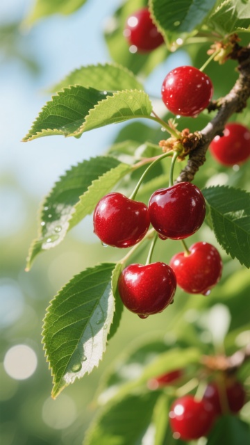 晶莹剔透的红色苹果挂满枝头,果实表面凝结着圆润的露珠,一颗露珠正从苹果底部滴落,翠绿的叶子舒展在果实间,阳光透过枝叶洒下温暖的光斑,背景是模糊的绿色自然景象,整体呈现出精致唯美的水彩画风格,色彩清新明快,笔触柔和细腻,充满自然生机与清晨的宁静氛围。