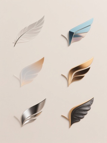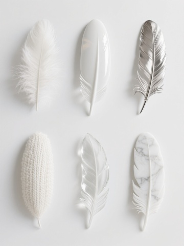 白色背景上,六个完全不同材质的同造型羽毛元素规整排布的系列素材集合。每个羽毛均保持原轻盈飘逸的羽毛形态和结构特征,从左到右、从上到下依次呈现:1. 柔和细腻的白色绒毛材质羽毛,带有轻微的光影渐变;2. 光滑亮泽的白色陶瓷材质羽毛,表面有细微的反光和温润质感;3. 透明通透的白色玻璃材质羽毛,边缘有精致的光晕效果;4. 带有金属光泽的银白色金属材质羽毛,表面有细腻的拉丝纹理;5. 温暖柔软的白色针织材质羽毛,呈现出清晰的编织纹路;6. 洁白纯净的白色大理石材质羽毛,带有自然的石纹肌理。整体画面简洁干净,色彩以白色为基调,通过不同材质的质感差异形成丰富的视觉层次,每个羽毛元素独立清晰,整体布局规整有序,具有强烈的设计感和系列感,能在短时间内清晰传达核心视觉信息。