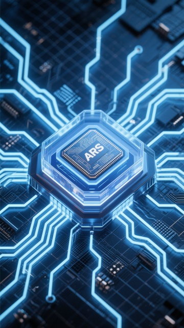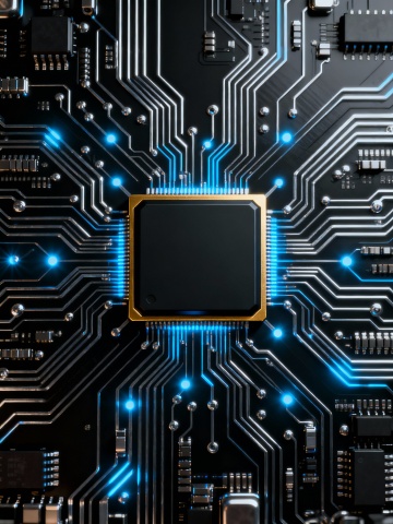 一张具有未来科技感的数字艺术海报,以红色和紫色为主色调,中央是一个造型变换为六边形的微处理器芯片,芯片边缘有发光的金色引脚,周围环绕着复杂交错的电路板线路,线路呈现出流动的红色和紫色光芒,部分线路末端有闪烁的光点,背景为深邃的黑色,整体营造出神秘而先进的科技氛围,光线从芯片中心向四周辐射,形成明显的视觉焦点和层次感,色彩对比强烈,科技感十足。