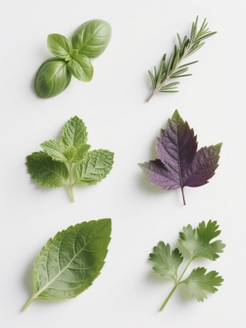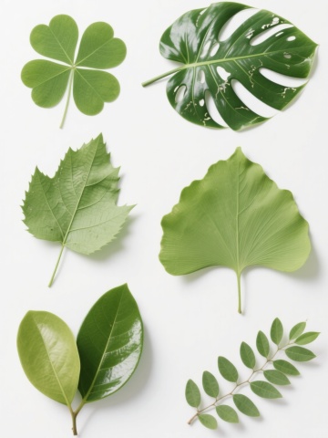 六个不同材质的绿色茶叶叶片元素,保持原有的飘落造型,每个元素拥有完全不同的整体色彩,采用纯色背景,规整排布形成系列素材集合,高清细节,产品展示风格,简洁构图,每个叶片材质清晰可辨,色彩鲜明且各不相同,整体视觉统一协调。