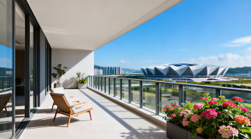 现代超写实建筑效果图,三栋高耸入云的玻璃幕墙摩天大楼矗立在城市中心,建筑外观呈现冷色调的蓝色玻璃与金属框架结构,表面反射着天空的光线,展现出光滑细腻的材质感和强烈的现代都市气息。大楼底部为橙色几何形态基座,与上部玻璃幕墙形成鲜明对比。背景是广阔的城市天际线,远处可见密集的中高层建筑群和隐约的海景,天空为晴朗的蔚蓝色,点缀着少量薄云,阳光从侧上方照射,在建筑表面形成明亮的高光和清晰的阴影,整体画面通透、开阔,充满科技感与未来感。将原环境中的城市背景替换为被茂密热带雨林环绕的景象,摩天大楼从郁郁葱葱的绿色植被中拔地而起,近处可见高大的热带树木、藤蔓和蕨类植物,远处是层叠的山峦,天空依旧保持晴朗的蓝色调,光线效果与原风格统一,营造出自然与现代建筑和谐共存的独特氛围。