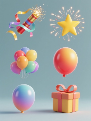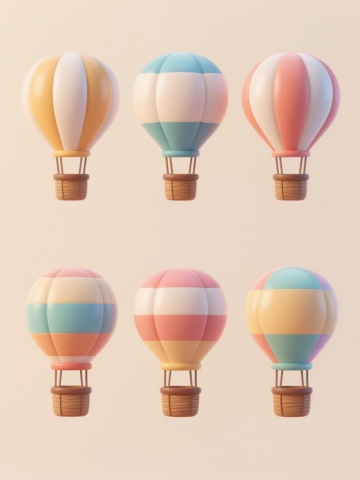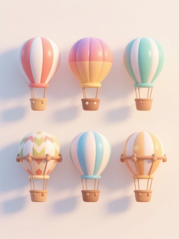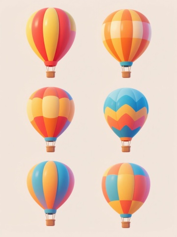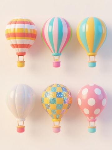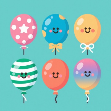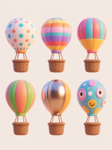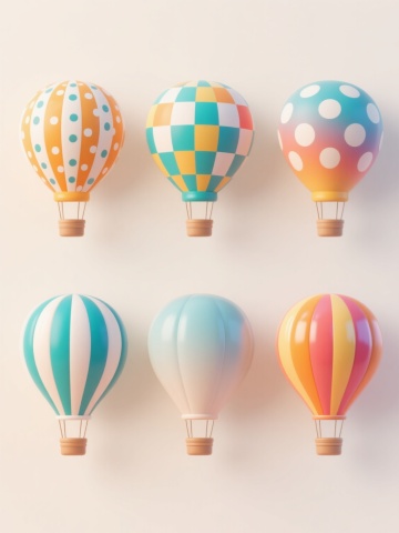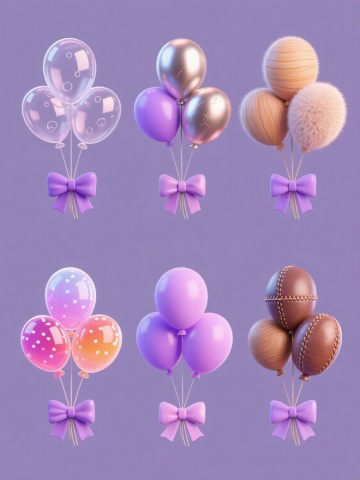 一套6个规整排布的系列素材集合,每个素材均为相同造型的一束气球(5个气球束在一起,下方系有紫色蝴蝶结),保持原卡通艺术风格、简洁构图和平滑边缘线条,采用纯色背景。第一个气球为玻璃材质,通透光滑,带有折射光效和内部气泡;第二个为金属材质,表面有磨砂质感和细微划痕,呈现哑光金属光泽;第三个为毛绒材质,表面有柔软绒毛质感,色彩柔和;第四个为木质材质,呈现木纹肌理和自然木色;第五个为糖果材质,半透明果冻质感,色彩鲜艳带有糖霜光泽;第六个为皮质材质,表面有细腻皮革纹理和缝线细节,呈现经典皮质光泽。每个素材中的气球色彩均进行整体变换,且与对应材质特性相匹配,背景为单一纯色,无文字、LOGO及其他装饰元素。