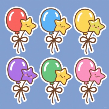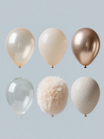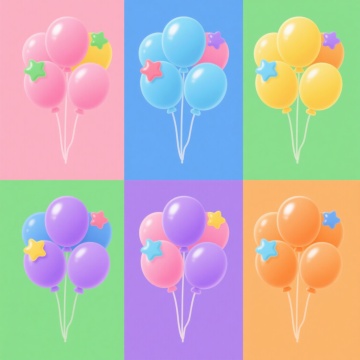 一套6个不同材质的卡通风格气球集合,每个气球都保持相同的束状造型(由多个圆形气球通过绳子连接,底部系有蝴蝶结),背景为纯色。第一个气球呈现光滑塑料质感,色彩鲜艳饱和;第二个为哑光磨砂质感,颜色柔和低饱和;第三个是金属光泽质感,带有反光和高光;第四个是透明玻璃质感,半透明效果并带有折射光影;第五个是绒毛质感,表面有细微的绒毛纹理;第六个是木纹质感,气球表面呈现木纹肌理。所有气球整齐排列在画面中,周围点缀着彩色小星星,整体保持卡通插画的线条风格和简洁构图。