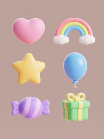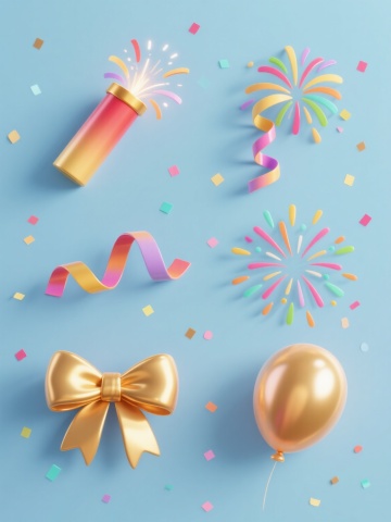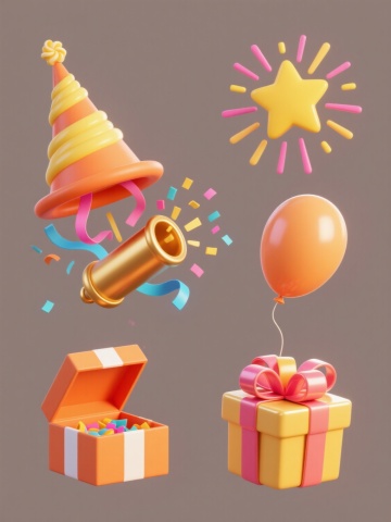 系列素材集合,规整排布在纯色背景上,保持简约现代的卡通插画风格,六个完全不同的节日庆典元素,每个元素都采用圆润的线条、鲜明的色彩对比和渐变过渡,具有轻微的立体感和光泽感,元素包括:1. 橙色和粉色条纹的派对帽,帽口飞出彩色卷曲彩带和圆点;2. 蓝色和紫色渐变的气球束,系着黄色丝带,气球上有白色高光;3. 红色和黄色的纸杯蛋糕,顶部有白色奶油和彩色糖屑;4. 绿色和蓝色的礼物盒,系着粉色蝴蝶结,盒盖微微打开,露出金色光芒;5. 紫色和粉色的生日蜡烛,蜡烛上有黄色火焰,周围有白色光点;6. 黄色和橙色的烟花,呈放射状绽放,有红色、蓝色和紫色的火花,所有元素大小一致,间距均匀,整体视觉风格统一。