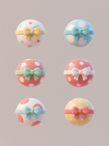 一套6个规整排布的系列素材集合,每个素材均为相同造型的一束气球(5个气球束在一起,下方系有紫色蝴蝶结),保持原卡通艺术风格、简洁构图和平滑边缘线条,采用纯色背景。第一个气球为玻璃材质,通透光滑,带有折射光效和内部气泡;第二个为金属材质,表面有磨砂质感和细微划痕,呈现哑光金属光泽;第三个为毛绒材质,表面有柔软绒毛质感,色彩柔和;第四个为木质材质,呈现木纹肌理和自然木色;第五个为糖果材质,半透明果冻质感,色彩鲜艳带有糖霜光泽;第六个为皮质材质,表面有细腻皮革纹理和缝线细节,呈现经典皮质光泽。每个素材中的气球色彩均进行整体变换,且与对应材质特性相匹配,背景为单一纯色,无文字、LOGO及其他装饰元素。