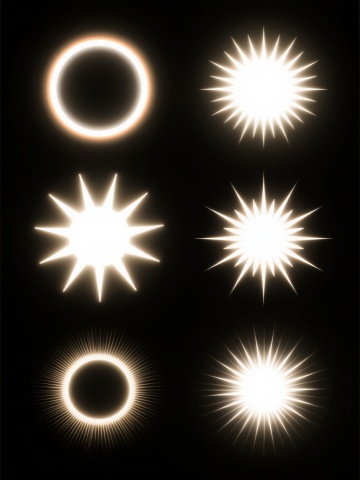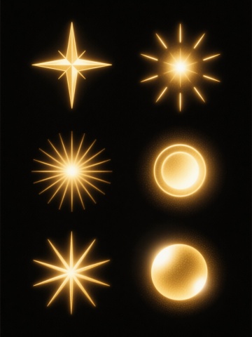 扁平插画风格,纯黑背景,六个具有高度统一视觉风格的数字艺术光效元素集合,每个元素均保留核心的圆形光晕结构、明亮的中心光点、向外辐射的锐利星芒以及彩色(浅金、浅粉、白)的边缘色散效果,整体呈现出强烈的科技感与未来感,光影对比鲜明,细节丰富。第一个元素为标准正圆形光晕配十字星芒,第二个是略微椭圆的光晕配放射状不规则星芒,第三个是中心光点偏移的不对称光晕配多束长短不一的星芒,第四个是光晕边缘带有细微锯齿纹理的圆形配米字形星芒,第五个是中心光点呈六边形的光晕配向外渐细的星芒,第六个是光晕内部带有同心圆纹理的圆形配十字交叉但末端分叉的星芒。所有元素采用相同的金粉色调为主的配色方案,以规整的2x3网格形式排布在纯黑背景上,元素间间距均匀,整体构图平衡且具有强烈的系列感和设计感。
