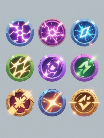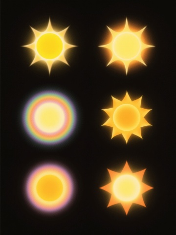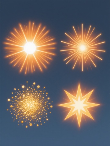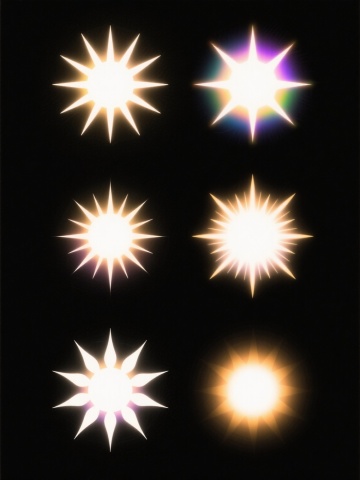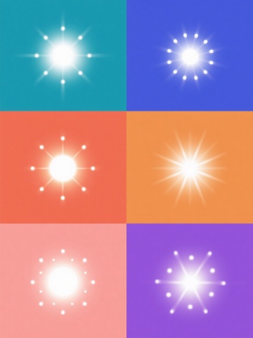 一组6个完全不同风格的光斑系列素材集合,规整排布。每个光斑保持核心的明亮光点、星形光芒和彩色光晕特征,但造型各异:1. 极简几何风:圆形光斑,纯色正红色背景,锐利边缘,高对比度白光与霓虹粉紫光晕。2. 梦幻水彩风:柔和不规则边缘光斑,纯色天蓝色背景,半透明水彩质感,柔和扩散的蓝白光芒与淡粉橙光晕。3. 复古波普风:星形光斑,纯色明黄色背景,粗黑轮廓线,饱和品红光点与蓝绿色光晕,波普艺术感。4. 未来科技风:多边形光斑,纯色深紫色背景,金属质感,冷调蓝白光点与青色霓虹光晕,带有科技感线条细节。5. 手绘涂鸦风:自由手绘线条光斑,纯色草绿色背景,蜡笔质感,暖调橙黄光点与红色晕染,边缘带有随性笔触。6. 渐变磨砂风:椭圆形光斑,纯色渐变紫粉色背景,磨砂玻璃质感,柔和的粉白光点与淡紫色光晕。所有光斑元素在各自纯色背景中居中,整体构图简洁,系列感强,适合作为设计素材使用。