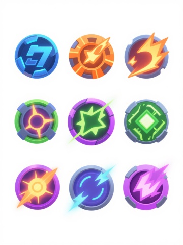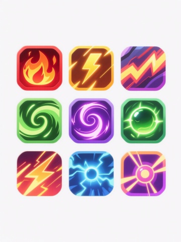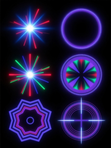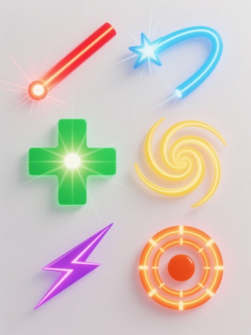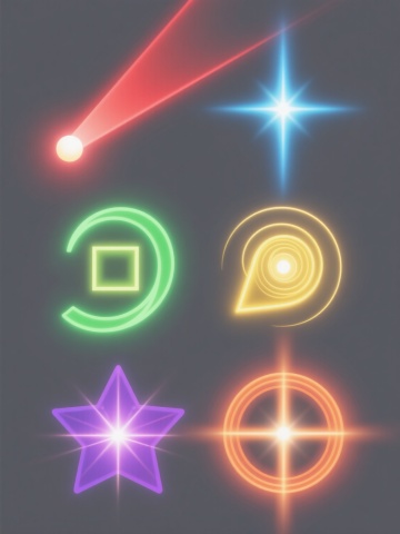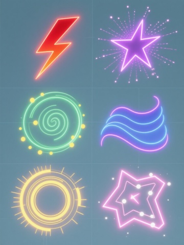 在纯色背景上,以数字艺术风格呈现六个完全不同造型的激光元素系列素材集合,整体采用规整的网格排布。每个激光元素均保持明亮的发光效果、清晰的线条轮廓、细腻的光效渐变以及向外扩散的光晕和点状粒子细节,同时各自拥有独特的形态结构:第一个为红色闪电状激光束,带有分叉的电光纹路和橙色内芯;第二个是绿色螺旋形激光,呈现旋转上升的形态并伴有黄色光点;第三个为蓝色波浪形激光带,边缘有紫色辉光和流线型波纹;第四个是紫色星形激光团,中心明亮向外辐射出多条光带;第五个是黄色环形激光,由多个同心圆光轨和放射状线条组成;第六个是粉色不规则几何形激光,融合了折线与曲线元素并带有白色闪光点缀,所有元素均保持一致的光影质感和视觉和谐度。