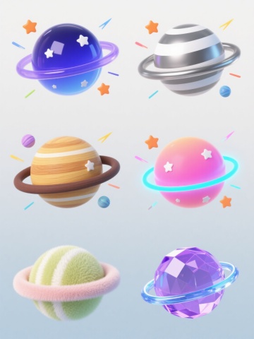 一组6个相同造型的卡通风格行星图标集合,每个行星都有带白色条纹的环形轨道、表面点缀着白色星星和橙色小星星,周围环绕着彩色小星球和流星线条,整体呈圆形构图,行星位于中心位置,所有图标在纯色背景上规整排列成2行3列的网格布局。第一个行星采用光滑玻璃材质,呈现深邃的蓝色渐变,环形轨道为半透明紫蓝色,背景为纯白色;第二个行星为哑光金属质感,整体呈银灰色,环形轨道为磨砂金属灰并带有白色高光条纹,背景为浅灰色;第三个行星是木质纹理材质,行星表面为温暖的棕黄色木纹,环形轨道为深棕色并保留白色条纹,背景为米白色;第四个行星为霓虹灯发光材质,行星主体为亮粉色渐变并带有发光边缘,环形轨道为亮蓝色发光效果,白色条纹部分发光更强,背景为深紫色;第五个行星是毛绒材质,整体呈柔和的浅绿色,表面有绒毛质感,环形轨道为浅粉色毛绒材质,白色条纹为白色绒毛,背景为淡蓝色;第六个行星为水晶材质,呈现清澈的紫色透明感,内部有细微的水晶纹路,环形轨道为透明蓝色水晶并带有白色条纹,背景为淡黄色。所有图标保持完全一致的元素内容和造型结构,仅在材质表现和整体色彩上形成鲜明对比,每个图标独立在各自的纯色背景中,整体设计风格统一为可爱卡通,视觉效果和谐且富有系列感。