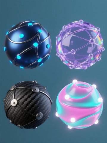 纯色背景上,四个规整排列的科技系列素材集合,每个素材均保留由连贯曲线、线条和点缀圆点构成的抽象球形网络结构核心元素但变换造型,整体色彩各异。第一个为深邃蓝金属质感,球形线条呈现出抛光合金的冷冽光泽与精密拉丝纹理,圆点如嵌入的蓝色LED灯般散发微光;第二个是透明水晶材质,淡紫色调的球形网络如同激光切割的水晶构件,线条边缘有折射的七彩光晕,圆点似气泡般悬浮其中;第三个为哑光碳纤维纹理,黑色背景上的深灰色球形线条呈现出碳纤维特有的编织纹路,圆点为金属铆钉质感;第四个是液态霓虹效果,粉色与青色渐变的球形线条如同流动的液态光,边缘有模糊的辉光扩散,圆点则是明亮的光斑,整体设计具有强烈的科技感与视觉冲击力,信息传达简洁高效。