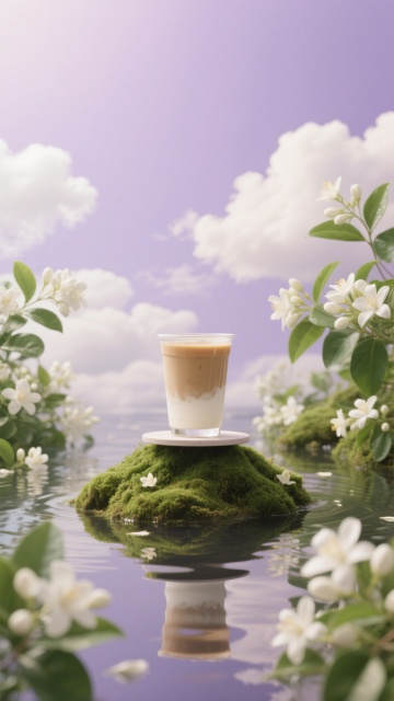 透明玻璃杯中盛有层次分明的拿铁咖啡,顶部奶泡呈现精致的白色树叶拉花图案,杯底垫着棕色编织杯垫,置于自然光照下的大理石桌面上,背景改为清晨薄雾笼罩的森林场景,阳光透过枝叶洒下斑驳光影,空气中漂浮着细小的尘埃颗粒,整体保持高清写实摄影风格,突出咖啡的醇厚质感与自然环境的清新宁静氛围。