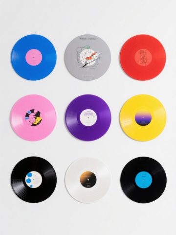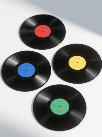 一张设计简约的黑胶唱片机产品展示图,采用高清晰度的3D渲染技术,具有光滑的塑料质感和金属光泽。画面主体是一个黑色圆形唱片,中央有一个红色标签区域,银色金属唱臂从右侧伸出,末端是白色唱头。整体构图为对称的圆形布局,背景为纯白色,突出产品主体。光线为柔和的顶部光源,在唱片表面形成轻微的渐变高光,边缘有白色细边框。设计风格现代、极简,注重产品形态的精准呈现和材质的细腻表现,传达出高端、精致的科技产品感。