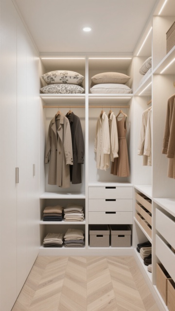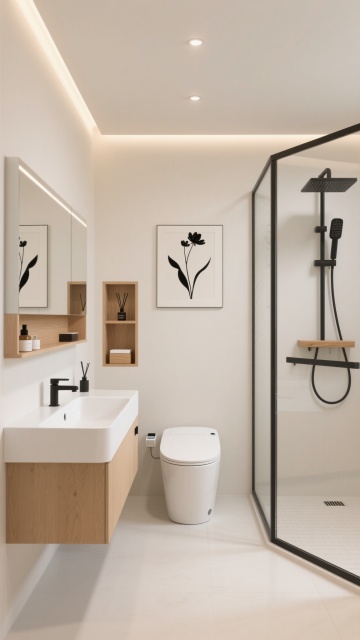 极简主义风格的卫生间室内设计,整体采用米白色与浅木色的柔和配色方案,温暖的嵌入式灯带与顶部筒灯提供均匀柔和的照明,营造明亮通透的氛围。墙面和地面铺设大块浅色哑光瓷砖,线条简洁流畅。不同场景下的卫生间摆设:有的配备悬挂式白色洗手台,台面整洁,搭配简约白色水龙头,上方是带储物功能的镜柜,旁边装有黑色金属毛巾架;有的设置独立玻璃淋浴房,内部有壁龛收纳洗浴用品,黑色淋浴喷头与五金件形成精致对比;有的墙面悬挂线条简约的黑白花卉装饰画,下方嵌入木质灯带壁龛,摆放香薰和装饰摆件;有的空间内放置智能马桶,旁边设有带木质搁板的收纳区。整体设计注重功能性与美学的平衡,空间布局合理,细节处理精致,呈现出现代、干净、舒适的卫生间环境。