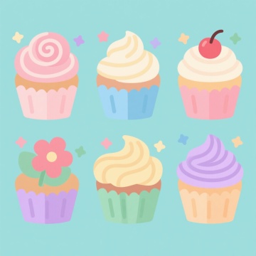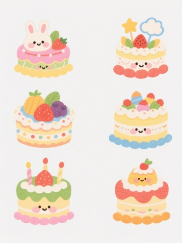 一组六个造型各异但元素相同的系列素材集合,每个元素均为卡通风格的生日蛋糕,采用纯色背景,保持原有的简约扁平设计风格和线条特点,画面整体色彩进行变换,每个蛋糕拥有不同的主色调,原有的笑脸、黄色腮红、绿色边框、蓝色奶油、彩色条纹蜡烛、黄色星星和装饰线条等元素内容保持不变,但每个蛋糕的造型完全不同,包括不同的蛋糕层数、奶油形状、蜡烛数量和摆放位置、装饰图案的细微变化,所有元素规整排布在画面中,形成统一和谐的系列感。