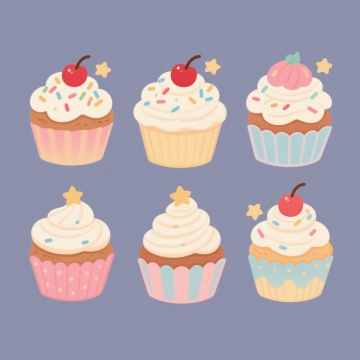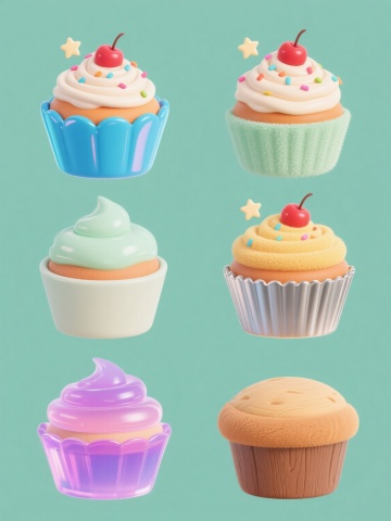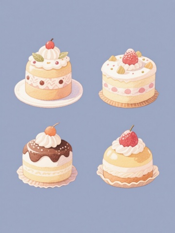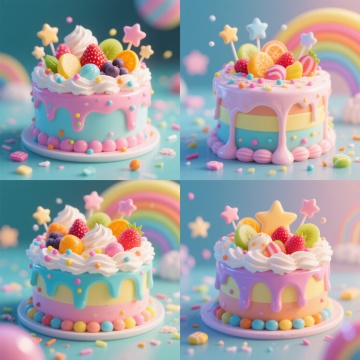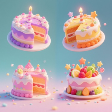 一套四个不同元素的系列素材集合,每个元素均采用圆润可爱的3D立体卡通风格,拥有光滑的表面质感和柔和的渐变色彩,高光部分明亮突出,底部带有淡淡的阴影效果,整体呈现出温馨甜美的氛围,元素被规整地排布在纯色背景上;第一个元素是一个蓝白渐变的双层生日蛋糕,顶部插着一根红白条纹的点燃蜡烛,旁边有一个黄色星星形状的饼干,蛋糕表面覆盖着白色奶油,边缘有波浪形花纹;第二个元素是一个粉紫渐变的三层冰淇淋甜筒,最上面是一个粉色的樱桃,甜筒表面有白色的糖粒,每一层冰淇淋的颜色由下至上逐渐变浅,底部是棕色的脆筒;第三个元素是一个黄绿渐变的圆形饼干礼盒,礼盒上系着一个粉色的蝴蝶结,礼盒表面有白色的波点图案,礼盒的盖子微微打开,露出里面的几块不同形状的饼干;第四个元素是一个橙红渐变的圆形甜甜圈,甜甜圈表面覆盖着橙色的糖霜,上面撒着白色的糖屑,中间的孔洞周围有一圈白色的奶油花边,顶部放着一颗红色的草莓。