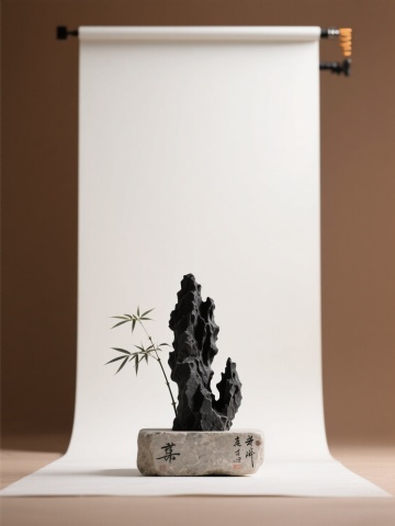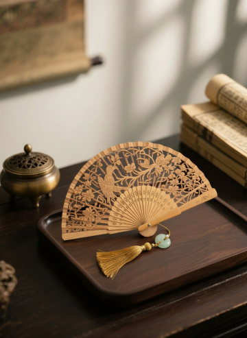 古朴典雅的中式书房一角,深棕色背景墙营造出沉稳静谧的氛围,柔和的侧光从左上角斜射而下,在墙面投下细腻的光影层次。一张深色实木案几上,铺展着一卷泛黄的古籍,书页边缘微微卷起,纸张纹理清晰可见。案几右侧放置着一件精巧的紫檀木笔架,雕刻有缠枝莲纹,底部三足呈兽蹄状,木质表面光滑温润,展现出岁月沉淀的包浆质感。案几边缘有自然的木纹和轻微的做旧痕迹,左侧隐约可见部分雕花屏风的一角,整体画面充满传统文人气息,光影柔和,色调统一,细节丰富,营造出宁静致远的东方美学意境。