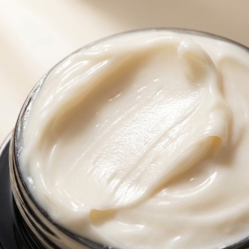 精致的白色乳霜置于铺满翠绿苔藓的原木之上,周围散落着棕色颗粒状物体,背景为模糊的绿色植物与几片带水珠的翠绿叶子,整体呈现清新自然的水彩画风格,柔和的笔触,通透的色彩晕染,细腻的纹理表现,光影柔和,营造宁静自然的氛围,构图以原木和苔藓为主体,乳霜为视觉焦点,背景虚化突出主体。