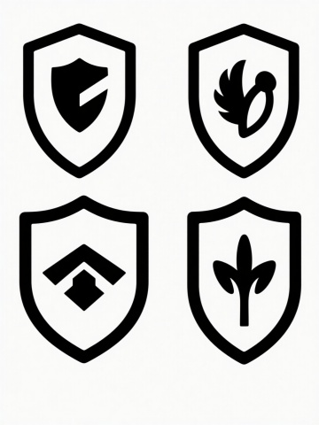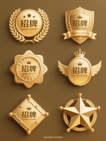 一组九枚复古风格徽章设计,采用金色和深红色为主色调,纯黑色背景。每个徽章均包含皇冠元素,搭配不同的装饰组合:展翅狮鹫立于盾牌之上、环绕五角星的月桂枝、城堡剪影与环形星星、六边形边框内的星形图案、菱形徽章中的放射状星芒、带翅膀狮子与战斧、箭矢交叉环绕的皇冠、双斧护卫的星形冠冕、以及繁复卷草纹装饰的华丽皇冠。所有徽章均以精细的线条勾勒,呈现出古典纹章学的对称美感和装饰细节,无任何文字元素。