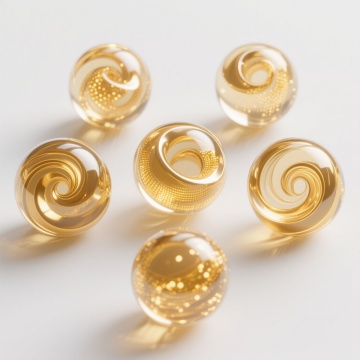 六个完全不同造型的透明玻璃质感球体,每个球体内部都有金色的液体和气泡,球体表面有高光和反光,整体呈现出晶莹剔透的感觉,背景是纯白色,六个球体规整地排列成两行三列,每个球体的造型和内部气泡分布都各不相同,第一个球体是标准的圆形,内部有少量气泡;第二个球体是椭圆形,内部有大量小气泡;第三个球体是不规则的水滴形,内部有一个大气泡;第四个球体是方形,内部有气泡和金色的光斑;第五个球体是三角形,内部有气泡和金色的线条;第六个球体是星形,内部有气泡和金色的颗粒。