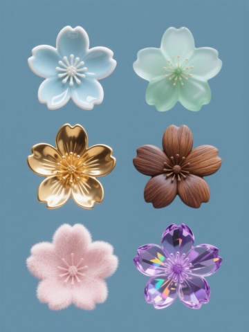 纯色背景上,六个造型完全不同的樱花图案系列素材集合,保持简约现代的扁平设计风格,每个樱花图案均采用粉色系配色,线条简洁流畅,花蕊细节精致,整体呈现规整排布的视觉效果,每个樱花图案具有独特的花瓣形状和花蕊设计,既保持系列统一性又各具特色,设计感十足,适合作为装饰元素或图案素材使用。