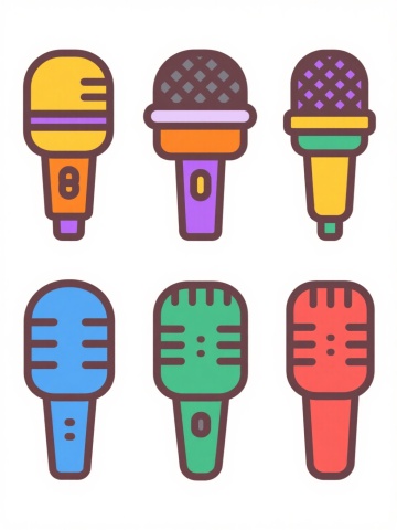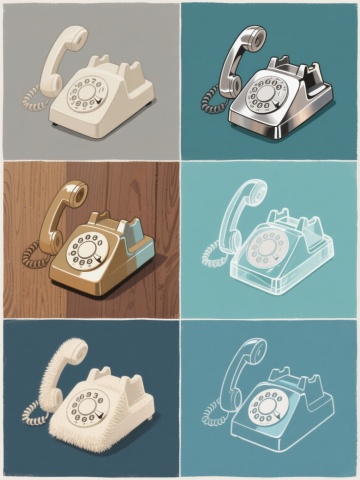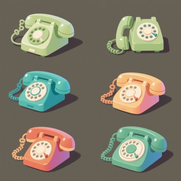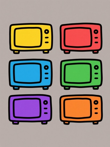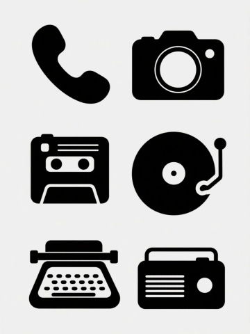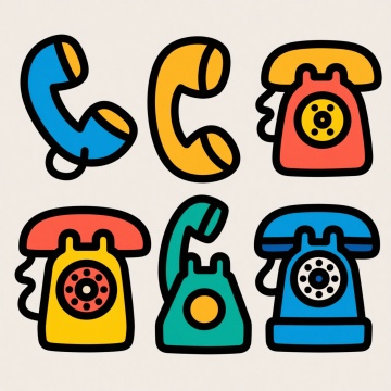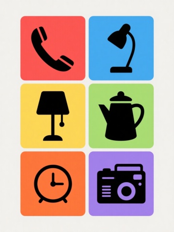 六个具有统一扁平插画风格的复古生活用品图标系列,每个图标均为纯色背景,整体色彩方案各异且明快,元素类目保持一致的复古生活用品主题,包含:1. 黄色主体带灰色听筒的老式旋转拨号电话,2. 蓝色主体带白色壶嘴的复古保温热水壶,3. 绿色主体带红色按钮的经典收音机,4. 粉色主体带银色边框的台式闹钟,5. 紫色主体带黑色转盘的老式唱片机,6. 橙色主体带透明视窗的复古电视机,所有图标均采用黑色描边线条勾勒轮廓,内部填充均匀色块,无渐变阴影,规整排列成两行三列的网格布局,每个图标独立清晰,整体视觉风格统一且协调。