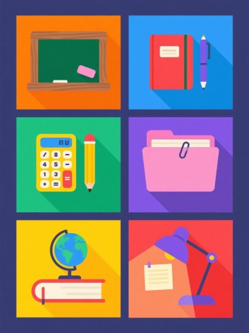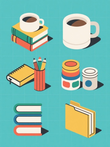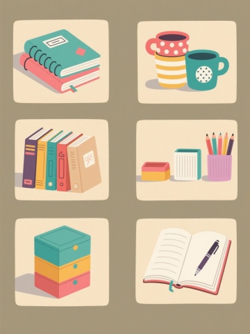 一组六幅规整排布的卡通风格静物插画,每幅均为纯色背景,保持统一的平面化设计语言、清晰的轮廓线条、简约的色块填充和低饱和度的柔和色调,画面整体色彩各异但和谐统一。第一幅:三本叠放的不同颜色笔记本,封面上有简约线条装饰和几何形状贴纸;第二幅:四个堆叠的彩色马克杯,杯身上有条纹、波点和简单图案;第三幅:五本不同尺寸的精装书整齐排列,书脊颜色各异并带有极简图标;第四幅:三个不同形状的铅笔盒与几支彩色铅笔组合,线条简洁明快;第五幅:四个堆叠的彩色方形收纳盒,表面有细微的纹理区分和简单符号;第六幅:三本打开的笔记本与一支钢笔的组合,页面边缘有简约装饰线条。所有元素均保持相同的卡通插画风格,通过大小、颜色和细微形态变化形成系列感,整体布局规整有序,每个元素都有明确的轮廓和填充色,无复杂细节和阴影效果。