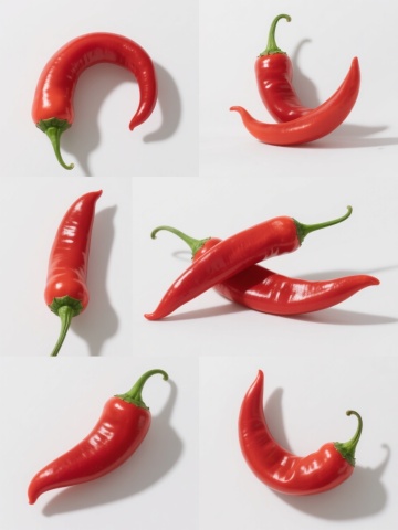 六个完全不同的彩色辣椒及彩椒元素的集合,保持高写实摄影风格,每个辣椒/彩椒拥有饱满光滑的质感、清晰的纹理细节和自然的高光阴影,色彩鲜艳饱和(包含红色、黄色、橙色、绿色等不同彩椒颜色),形态各异(如完整的、切开的、不同朝向的、不同品种的辣椒/彩椒),在纯色背景上呈规整网格状排布,无任何文字、LOGO、二维码及额外装饰元素,整体画面简洁明快,突出蔬菜的新鲜与真实感,符合高质量食品素材的视觉标准。