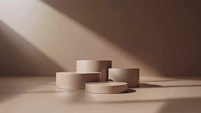 极简主义展台设计,采用低饱和度的米色和柔和金色为主色调,圆形展台台面呈现光滑的金属质感,表面有细腻的光影反射,背景为模糊的暖色调光斑,光线从上方斜射下来在台面上形成自然的明暗过渡和柔和阴影,整体氛围优雅、简约且具有高级感,没有任何多余的装饰元素,突出展台本身的形态美和材质感。