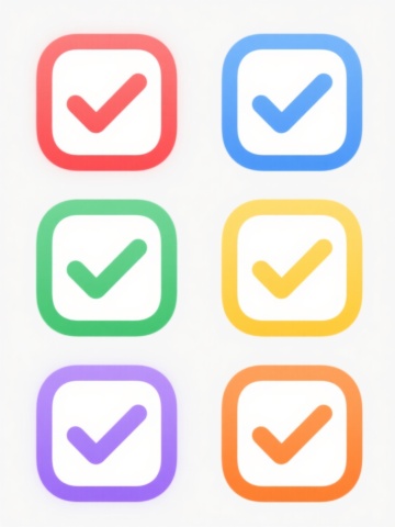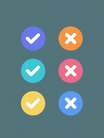 极简平面设计风格系列素材集合,纯色背景,规整排布六个完全不同配色的圆形图标组合,每个组合包含左侧带白色对勾符号的圆形和右侧带白色叉号符号的圆形,保持图标形态、大小比例和相对位置不变,色彩方案分别为:1. 左侧蓝色圆形配白色对勾、右侧橙色圆形配白色叉号;2. 左侧紫色圆形配白色对勾、右侧黄色圆形配白色叉号;3. 左侧青色圆形配白色对勾、右侧粉色圆形配白色叉号;4. 左侧墨绿色圆形配白色对勾、右侧深红色圆形配白色叉号;5. 左侧浅灰色圆形配白色对勾、右侧深棕色圆形配白色叉号;6. 左侧明黄色圆形配白色对勾、右侧靛蓝色圆形配白色叉号,所有图标边缘平滑无渐变,符号线条简洁清晰,整体视觉统一且色彩对比鲜明。