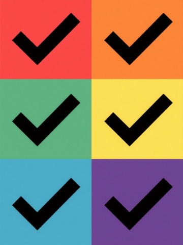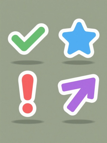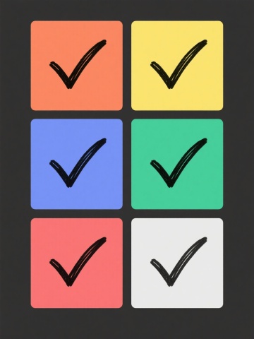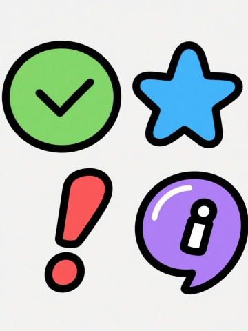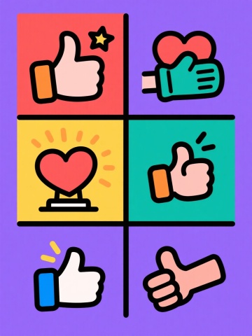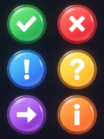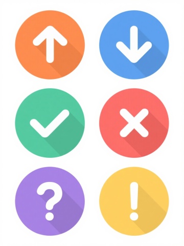 一组六个完全不同的卡通风格图标,每个图标都采用简洁圆润的黑色线条勾勒,线条流畅且带有轻微的手绘感,分别代表:1. 一个向上竖起的大拇指图标,指尖有三条短小的放射状线条;2. 一个向右的箭头图标,箭头为三角形,箭尾有两条短线;3. 一个圆形的信息气泡图标,内部有一个问号;4. 一个对勾图标,线条圆润,拐角处平滑过渡;5. 一个心形图标,线条流畅,顶部有一个小缺口;6. 一个星形图标,五个角圆润,线条均匀。所有图标均位于各自独立的纯色背景上,背景颜色分别为红色、蓝色、黄色、绿色、紫色和橙色,整体以2x3的网格形式规整排布,画面干净整洁,视觉效果统一。