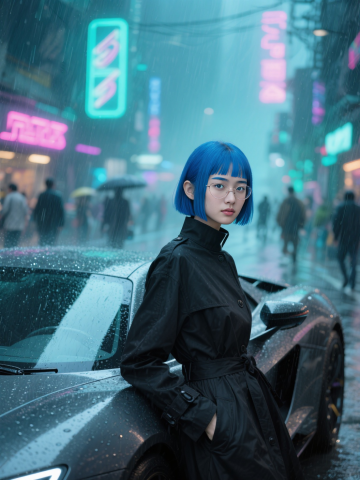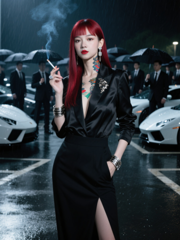 下雨夜晚,前景模糊,前景是保镖的肩膀和伞。画面中的主体是一位冷白皮御姐,轻熟风,正面。酒红色挑染长发发型,中分八字刘海,精致的妆容,丝绸衬衫,金属装饰品,黑色硬剪裁风格高定西装,黑色开叉高定长裤,细长金属棒耳饰,红唇冷笑,冷峻眼神,暗黑华丽风格。脖子一侧有大面积日式彩色纹身。昂贵金属手环,钻戒。右手姿势动作唯美,夹着香烟。神秘,冷漠,逆光,暗调背景。身后有很多穿着黑西装的保镖,场景设定在黑夜雨中的非常多顶级跑车的停车场,非常多的保镖撑着伞在她身后,模糊群像,模糊背景。be美学,胶片质感,轻微噪点,高级灰,青蓝色复古调色滤镜,电影感暗调。