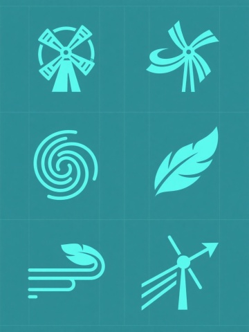 6个不同造型与角度的风元素符号,保持简洁线条与几何感的设计风格,采用统一的纯色背景,整体色彩变换为清新的蓝绿色调,每个风元素各具特色,有的呈旋转的漩涡状,有的是流动的曲线形态,有的带有飘逸的尾迹,元素之间间距均匀,规整地排列成两行三列的布局,画面简洁明快,视觉层级清晰,符合现代简约的设计感,适合作为系列素材集合使用。