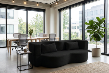 俯视角构图,在一个极简工业风客厅的几何中心,深灰色模块化布艺沙发呈不规则多边形展开,六个炭黑色皮质靠垫随意散落其上,沙发前悬浮着三个由粗砺混凝土浇筑的六边形矮几,几面上随意放置着两个黄铜材质的几何花瓶,里面插着干枯的尤加利枝。右侧墙面悬挂着一幅由生锈铁板切割而成的抽象艺术装置,与墙面裸露的红砖肌理形成材质对话。左侧整面墙是未经修饰的混凝土材质,仅在中央位置嵌入一扇黑色金属框架的窄高窗,冷冽的午后阳光透过窗棂在深灰色水泥地面投射出锐利的几何阴影。天花板悬挂着三盏黑色金属骨架的工业吊灯,灯泡外包裹着铁丝网罩。空间角落立着一盆高大的琴叶榕,栽在粗陶素坯花盆中。地面铺设着深灰色水磨石,表面保留着细微的金属骨料闪光。整个空间呈现出粗犷材质与精致几何的矛盾统一,色调以水泥灰、炭黑和铁锈红为主,营造出冷静克制却不失温度的都市工业美学。