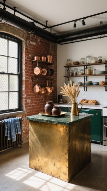 暗调工业风厨房室内设计,以深炭黑与古铜金为主色调,营造出粗犷而精致的氛围。粗糙的红砖墙保留原始纹理,部分墙面覆盖哑光黑色金属板,复古齿轮造型的壁灯投射出暖金色光斑在地面形成机械阴影。厨房采用中岛式布局,台面是厚重的黑色火山岩材质,边缘故意保留自然毛边,搭配拉丝古铜色金属框架的悬浮橱柜,柜门采用烟熏黑玻璃,内装暖黄色LED灯带照亮整齐排列的铜制炊具。中岛台面中央嵌入一个圆形铸铁水槽,旁边随意放置着一把黄铜材质的复古水龙头和一块带着明显刀痕的橡木砧板,砧板上散落着几颗深紫色的无花果。台面右侧摆放着一组做旧黄铜调味罐和一个装有新鲜迷迭香的黑色陶瓷花盆。背景墙悬挂着金属网格架,上面挂着铜制平底锅和手工锻造的铁艺厨具,墙角立着一台复古绿色的老式冰箱,顶部放置着一盆茂盛的琴叶榕。前景是中岛延伸出的吧台区域,几张黑色皮质高脚凳随意摆放,地面铺设深灰色水泥自流平,光线从顶部工业风吊灯和侧面窄条高窗斜射而入,在粗糙表面形成强烈的光影对比。
