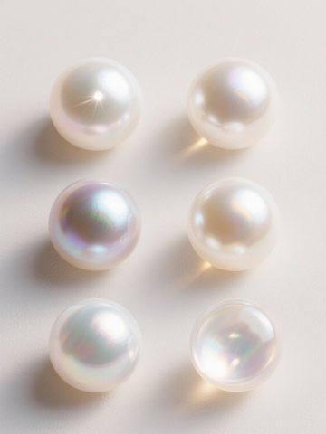 一张展示6个不同样式、不同光效珍珠素材造型的设计图,采用浅色背景,珍珠上下两行对齐排列。每个珍珠均呈现出高品质3D渲染效果,拥有圆润饱满的球体形态,表面光滑细腻,具有珍珠特有的柔和光泽与微妙虹彩晕染。不同珍珠的光效设计各具特色:有的展现强烈的单点高光配合柔和漫反射,有的呈现多光源照射下的复杂光影层次,有的强调深邃的阴影与明亮的反光对比,有的则突出珍珠半透明质地带来的温润光泽感,有的模拟自然散射光下的均匀细腻光泽,有的通过特殊光源营造出独特的光斑或光晕效果。整体构图简洁大方,珍珠之间间距均匀,排列整齐有序,光线效果清晰地展现了珍珠的立体感、材质感和高级质感,画面干净利落,视觉重点突出,达到了专业产品展示图的设计水准。