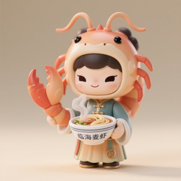 3D卡通虾拟人形象,穿中式服饰,手持热气腾腾的面条,可爱生动。