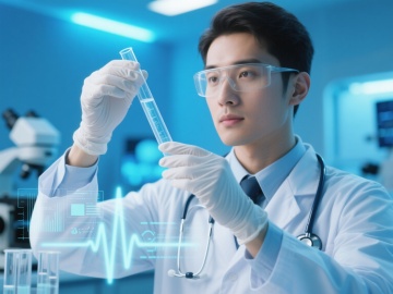 医疗科技感背景,蓝色与白色为主色调,柔和明亮的光线从上方照射,营造出洁净、专业且充满希望的氛围,画面中可见戴着白色乳胶手套的手正拿着装有黄色透明液体的玻璃试管,试管内液体有清晰的刻度,背景中隐约可见多个不同形态的玻璃器皿和实验设备,叠加着由六边形、线条、数据代码和分子结构组成的半透明科技感图形元素,整体呈现出高精度的3D渲染质感,光影过渡自然,细节丰富,构图以手部和试管为视觉焦点,背景元素层次分明,具有现代医疗实验室的视觉特征和科技感设计风格。