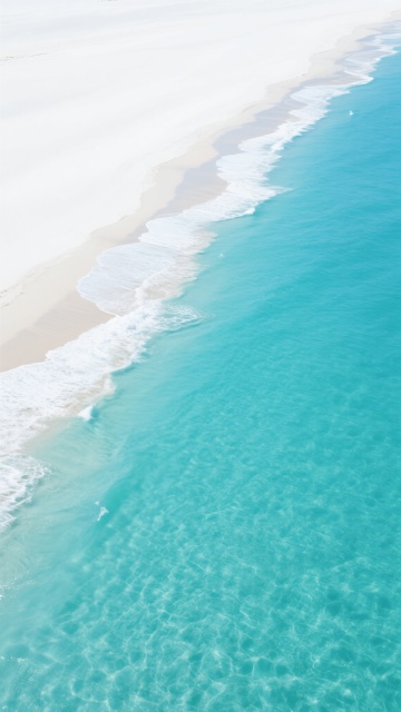 从高处俯瞰视角,纯净的浅蓝色海水,波光粼粼,海面上有白色的波浪,海浪拍打在沙滩上,溅起白色的浪花,远处是浅蓝色的天空,海天相接,画面清新、宁静、明亮,具有自然、简约的风格,色调和谐统一,光影柔和,营造出一种舒适、放松的氛围。