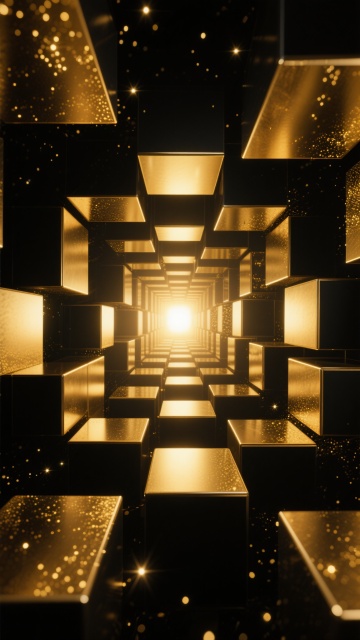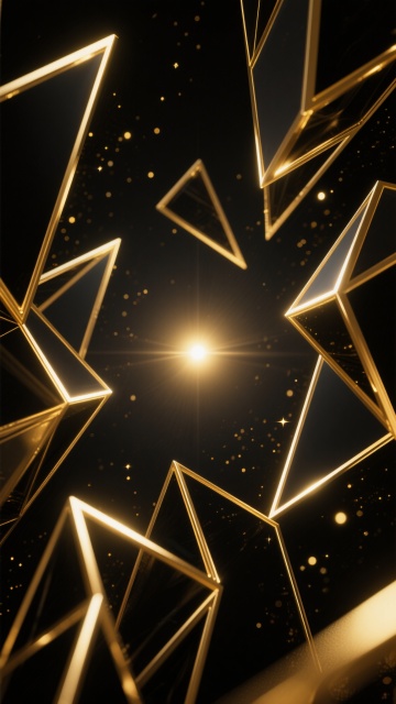 一个华丽的圆形舞台,舞台底部有三层金色的发光灯带,灯光在黑色的舞台表面形成了清晰的倒影。舞台后方是深邃的黑色背景,两侧垂落着带有金色光泽的弧形幕布。背景中垂直分布着多根细长的金色光柱,光柱之间飘散着金色的闪光粒子和细小的亮片,营造出奢华而梦幻的氛围。整个场景采用黑金配色,光影对比强烈,充满了高级感和舞台的仪式感。