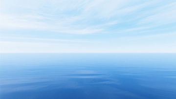 3D渲染风格的海面背景,以纯净的渐变蓝色为主色调,从深邃的海水蓝平滑过渡到清澈的天空蓝,营造出宁静、开阔、通透的氛围。阳光以柔和的顶光照射,在水面上形成细腻且均匀分布的波光粼粼效果,海面上布满规则而轻柔的波浪纹理,波浪线条流畅自然,呈现出平滑的3D质感和细腻的透明感。采用全新的低角度视角,仿佛从靠近海面的位置向上仰望,展现海水与天空在远处完美交汇的水平线,整体画面简洁干净,信息传达直接,充满平静而广阔的设计感。