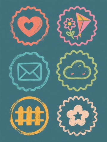 系列爱心图标设计,6个完全不同装饰的同元素内容素材集合,规整排布。每个爱心均保持相同的简约平面风格、光滑无纹理的纯色填充质感、圆润流畅的轮廓线条和纯白色背景。爱心颜色分别为:明亮的正红色、柔和的天蓝色、温暖的明黄色、清新的草绿色、优雅的淡紫色和活泼的粉红色。每个爱心上有独特装饰:1. 红色爱心:顶部有三条等距水平白色细线条;2. 蓝色爱心:表面分布着大小不一的白色圆点图案;3. 黄色爱心:中央有一个白色五角星图案;4. 绿色爱心:边缘有一圈白色波浪线;5. 紫色爱心:内部有一个白色的心形镂空图案;6. 粉色爱心:表面有交叉的白色斜线条纹。整体设计简洁明快,色彩鲜明,视觉层级清晰,信息传达高效,适合作为装饰元素或图标使用。