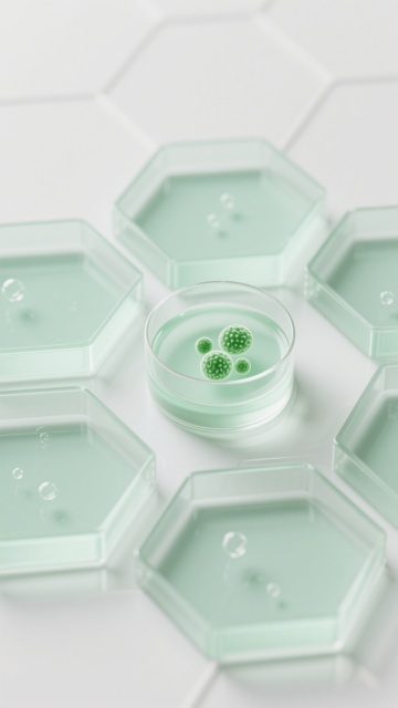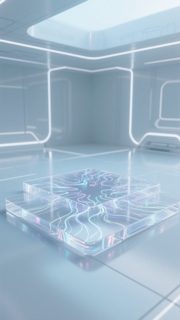 极简主义构图,全景视角下的未来生物实验室,纯净的白色与冰川蓝构成的无菌空间,墙面采用无缝纳米陶瓷板拼接,地面是反光率达95%的超白玻璃材质,顶部悬浮着呈几何阵列排列的环形LED光源,光线均匀地洒落在所有表面。左侧是模块化悬挂式试剂架,透明亚克力容器中装着梯度蓝色的生物试剂,下方嵌入式实验台配备隐藏式智能控制面板。中央区域放置着一台六边形结构的量子分析仪器,金属外壳呈现细腻的哑光钛白色。右侧墙面上的生物安全柜采用隐形门设计,与墙面融为一体。整个空间无任何视觉噪音,连空气都仿佛凝固在绝对静止中,只有试剂瓶上的分子结构标签在微光下隐约可见,完美平衡了科技冷感与空间美学,为内容展示提供极致洁净的背景画布。