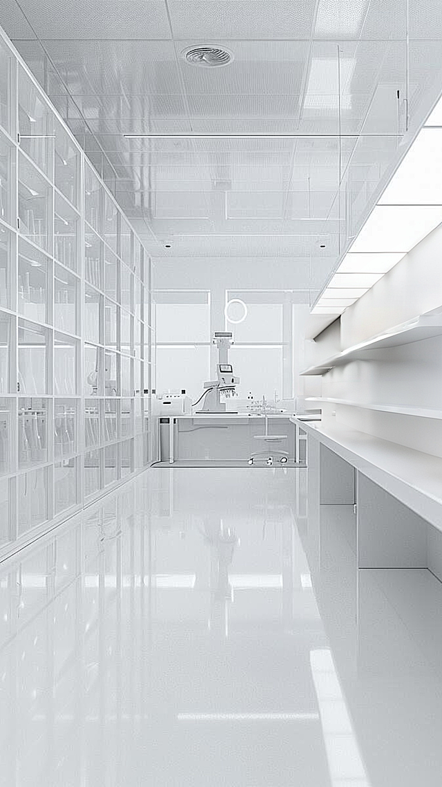 超写实风格的现代实验室内部场景,整体以纯净的白色和浅灰色为主色调,光线明亮均匀,天花板上排列整齐的长条形LED灯带与白色方形天花板面板形成规则的几何图案,地面为光滑的白色环氧地坪,反射出天花板和设备的清晰倒影。实验室中央是宽敞的通道,两侧是白色的实验台和储物柜,实验台上摆放着现代化的白色实验仪器和透明玻璃器皿,后方靠墙的白色金属架子上整齐排列着实验用品,远处有明亮的大窗户透进自然光,整个空间呈现出极度干净、规整、有序的氛围,线条简洁流畅,没有任何杂乱元素,适合作为背景使用,营造出专业、科技、无菌的感觉。详情
