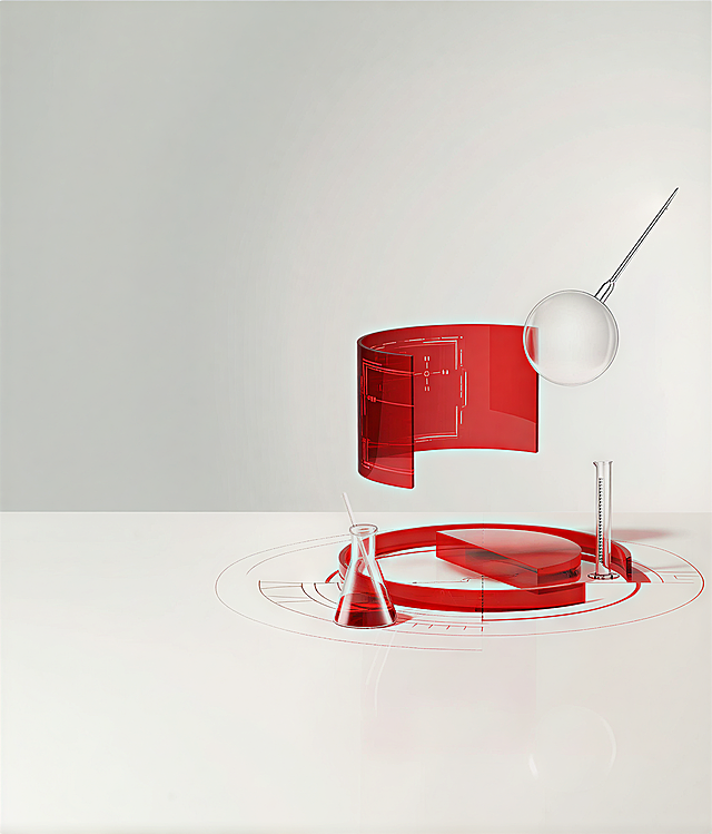 现代化的实验室场景,特写红白圆形展台,背景红白色调为主详情