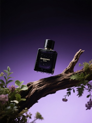 梦幻紫调中,香水瓶悬浮于古木枝桠,融合3D重拟物与玻璃风质感,虚实交织的自然奇境,尽显奢华优雅与神秘时尚。